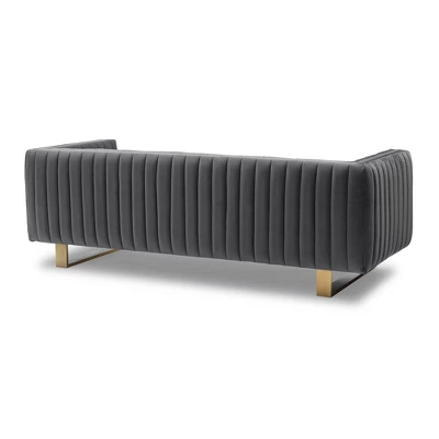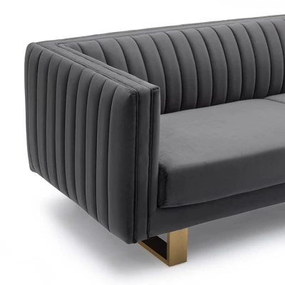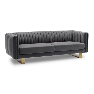 The Armen Living Delilah Dark gray Velvet Sofa with Matte Gold Legs offers your home a centerpiece of exceptional design. Our three-seater sofa brings your living room a stunning look with its deep channel stitching, velvet upholstery, and squared arms. Finished with a low-profile design, this sofa stands as a streamlined statement piece that can change the whole flow of your interior decor, creating an open, clean space. From its cozy design to its chic matte gold legs, our sofa will bring excellent comfort and style to any room.