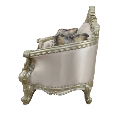 Exclusively designed and filled with romantic spirit, this beautiful sofa features Queen Anne legs and carved aprons and trims, decorated with raised and scrolled floral motifs in an antique champagne finish. Each piece of this sophisticated living room set boasts of curved and rolled arms, oversized molding and crystal-like button tufted backrests with nailhead trim. This three piece collection with contrasting accent pillows will bring sophistication to your living room and will add elegance to any room Decor.