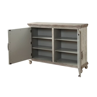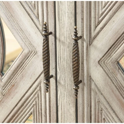 Hand carved door panels are inset with mirrored accents for a design inspired by Old World heirlooms, yet totally at home in today’s eclectic interiors. Finished in a light Francesco Ivory Rub, this Two Door Credenza features four fixed shelves inside, brushed metal hardware, and adjustable levelers to ensure the perfect fit for your home.