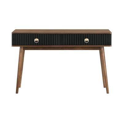 The Amigo Black Veneer and Walnut Wood Console Table from Armen Living is the reliable and rich console table you and your home have been searching for. This rich table features 2 drawers with a soft-closing gliding function – giving you ample space to organize your home. This table will make a simple storage solution to any well-appointed space in your home. The wonderful accents of this table add so much to this piece – especially the striking drawer pulls that stand out against the dark wood. Product Dimensions: 47″W x 16″D x 30″H