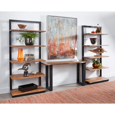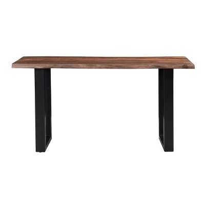 In your kitchen, den or foyer, this stunning Console Table will bring that wonderful natural component to your décor. Dark powder coated metal legs hold aloft a stunning piece of Sheesham wood, rich in the exotic graining that flows from end to end and gleaming in the Brownstone Nut Brown finish. Live edges have gentle curves, and being a natural element, no two will ever be alike. Beautiful anywhere you choose to put it, but especially nice when used with the matching Cocktail and End Tables.