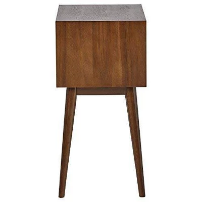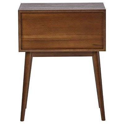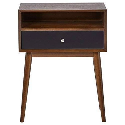 Thereβs something about mid-century modern design that makes it popular from decade to decade β and this side table exemplifies that charm. Subtly angled legs support simply styled table architecture to create subdued yet undeniable flair. The open upper shelf makes for a gorgeous contrast to the black-finished storage drawer below, accented by sleek silver pulls. The side table is perfectly sized to nestle between to accent chairs or to be placed beside your bed as a nightstand.