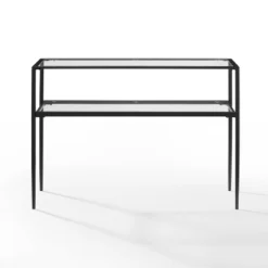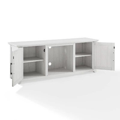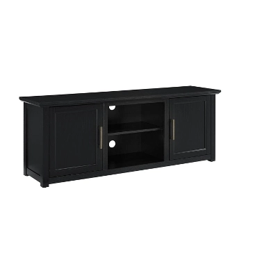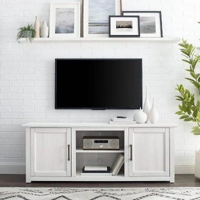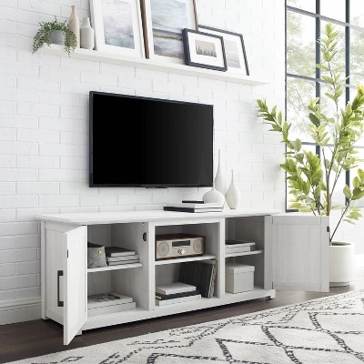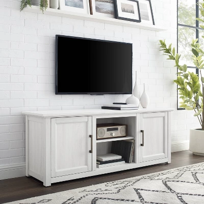 Gather together for a family movie night with the Camden Low Profile TV Stand. This TV stand features two cabinets with an adjustable shelf in each, offering ample storage for your books, video games, or other media. The open storage in the center has an adjustable and removable shelf, plus two pre-cut holes in the back for cable management. Sized to fit most TV’s up to 50 inches, the Camden Low Profile TV Stand exudes rustic style with the look of wood-grain and substantial metal hardware.