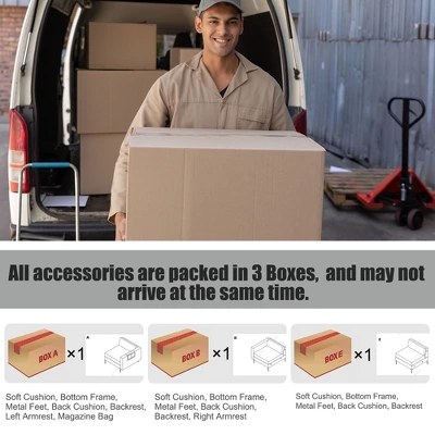 - Shipped in 3 Boxes: This 3-seat sofa couch comes with 3 boxes, so that you may not receive all the packages at the same time. The detailed instruction can guide you step by step through the installation. Overall dimension of the sofa: 94.5â x 32.5â x 32.5â (L x W x H); weight capacity of each seat: 660 lbs.