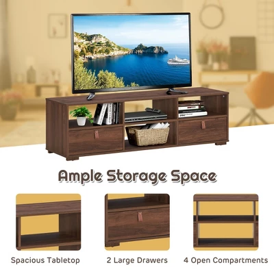 Crafted of high quality engineered wood, our TV stand is sturdy and durable with a long service life. 6 wide legs ensure excellent stability and the anti-scratch foot pads can protect your floor from damage. The spacious tabletop can support up to 60 inches of TV and some decorations. Two large drawers and open shelves provide ample storage space for your books, audio equipment, snacks, etc. In addition, PVC handles and smooth drawer rails allow you to access items with ease. With a simple and modern appearance, this TV cabinet will be the perfect complement to your living room, bedroom, lounge and other places!