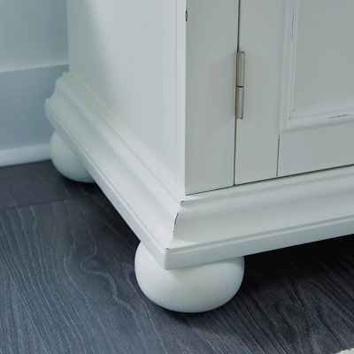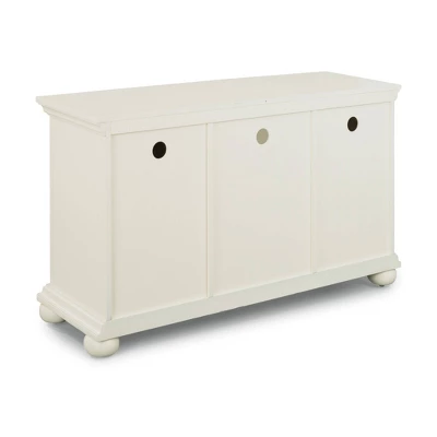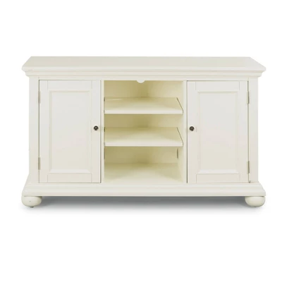Enjoy the charm of an urban farmhouse with the Homestyles Dover Entertainment Center. Support a flat screen TV and add a little extra storage for movies, remotes, and other household items. The solid hardwood and engineered wood combine to create an incredibly durable frame with elegantly carved details in a neutral distressed off-white finish with lightly hand-rubbed edges. Organize components in the middle shelves and neatly route cables through the back for a clean look.