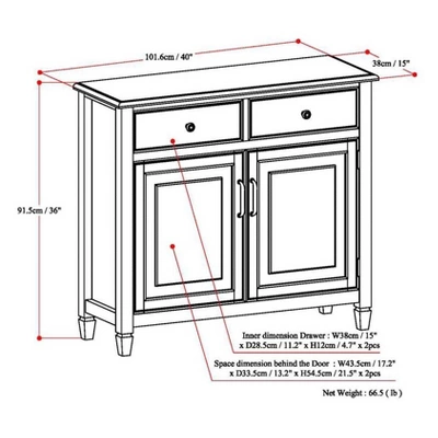 Hampshire Solid Wood 40 inch Wide Traditional Entryway Storage Cabinet in Rustic Natural Aged Brown. Includes vintage raised panel doors and drawers, notched legs, Bronze decorative hardware and a style reminiscent of the historic British Colonial style. Designed to provide versatile and functional storage in your hallway with 2 drawers for keys, gloves, hats and other items and 2 doors with large interior storage and interior adjustable shelves. Handcrafted with care using the finest quality solid pine. Size: 15″ d x 40″ w x 36″ h. . Efforts are made to reproduce accurate colors, variations in color may occur due to computer monitor and photography. The product is warranted to be free from defects in material and workmanship for a period of (1) year from the date of purchase to the original owner.