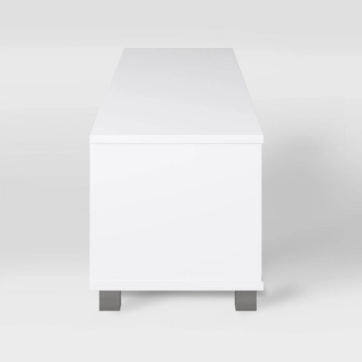 Take your living room to the next level with this stylish modern TV stand. Made with silver block legs, and open shelving for a sleek yet classic appearance. This entertainment center creates additional storage space in your home for media, electronics, accessories, books, or decor. The beautiful white finish paired with silver pillar legs looks great in any aesthetic. This bench fits most TVs up to 85″ and is the perfect combo of classic colors and finishes.