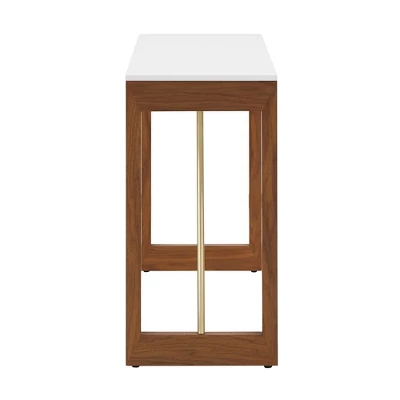 The Luna Two – Tone High Gloss White and Walnut Finish Sofa Table from Inspire Q updates your living space in stylish fashion. White, gold, and brown hues complement each other beautifully in this piece for an impressive look. The smooth table top is finished in a high gloss white finish that has some sparkle to it. A walnut finish accents the sides of this table, bearing a visible wood grain for a more down-to-earth aesthetic. Gold-finished metal bars complete this piece, adding clean-cut lines and a pop of glamour. Add this versatile piece to any contemporary or bold-themed space.