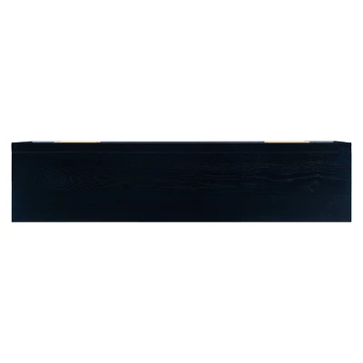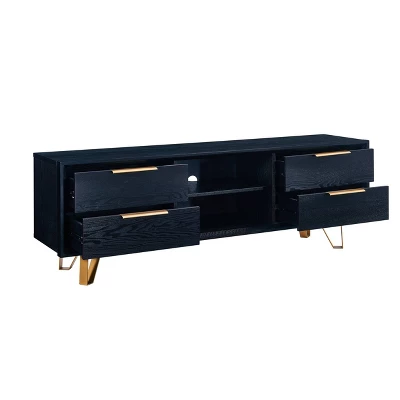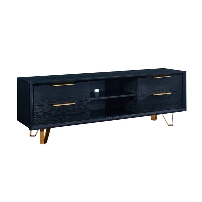 Modernize your media space with the Aiden Lane Markli TV Stand for TVs up to 61″ Black. Storage drawers and media shelves neatly organize electronics, cords, and movies, while sleek metal legs and drawer pulls add a bold pop of color to your living space. Tuck this low-profile media stand beneath your wall-mounted TV to keep video games and remotes out of sight, or add to your open concept space as a stylish centerpiece with a hint of retro flair. Enjoy modern design and small space functionality with this two-tone media stand.