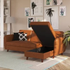 Perry Sectional Futon With Storage Convertible Sleeper Camel Faux Leather – Novogratz