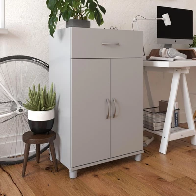Add convenient storage space to your home with the RealRooms Basin 24” 1 Drawer/2 Door Base Storage Cabinet. This Base Cabinet features a top drawer with metal drawer slides for years of use. Behind the 2 doors, you’ll find 1 adjustable and 1 fixed shelf. The adjustable feet make keeping your Base Cabinet level on uneven floors simple. Made of laminated MDF and particleboard, the Base Cabinet features a light gray finish that creates a refined, clean look in your home. Use this piece as a stand-alone item, or combine it with additional SystemBuild Lory storage items to create the perfect storage solution for your home. A wall anchor kit is included to secure the Cabinet to the wall and prevent tipping injuries. The Base Cabinet ships flat to your door and requires assembly upon opening. Two adults are recommended to assemble. Once assembled, the Base Cabinet measures to be 39.2”H x 23.46”W x 15.4”D.