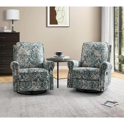 Crafted with human needs in mind, this recliner set features 360° swivel motion, a gliding function, and pop-up leg rest to provide comfort for resting. Ideal for discovering the perfect position that is most comfortable for you, this recliner set will quickly become your new favorite seat in the house. Constructed of soft and durable polyester fabric decorated with chic nail head trims, it offers a timeless design and can be used well for years. This recliner set can be used on many occasions, such as you can sit on it in the living room to enjoy watching TV or you can put it in your study room to enjoy reading books. Item Size:33.5″Wx36″Dx39″H, Seat Size:20.5″Wx19″Dx19.5″H