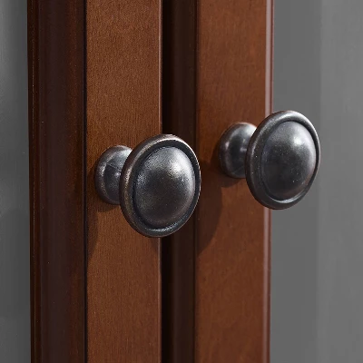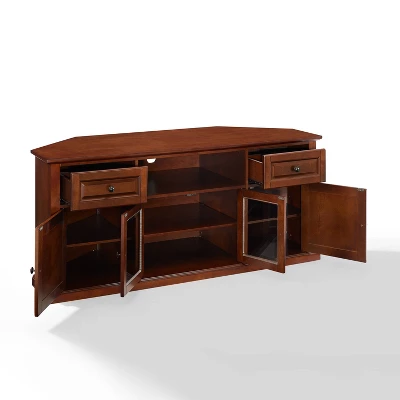 This signature corner TV cabinet accommodates most 60″ flat panel TVs, and is handsomely proportioned featuring character-rich details sure to impress. The hand rubbed, multi-step finish is perfect for blending with the family of furniture that is already part of your home. Features raised panel doors for concealed storage and also tempered beveled glass doors not only add a touch of class; they protect those valued electronic components, while allowing for complete use of remote controls. The open storage area generously houses media players and the like. Adjustable shelving offers an abundance of versatility to effortlessly organize by design, while cord management tames the unsightly mess of tangled wires.