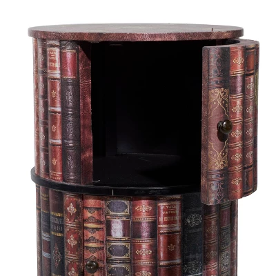 - •Faux leather storage side table features a round structure with two tier cabinet doors and upholstered with vintage style books on the exterior, and black knobs for easy open