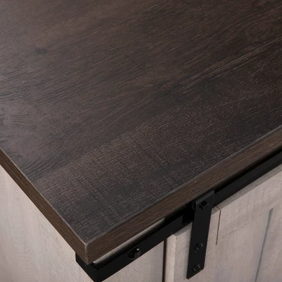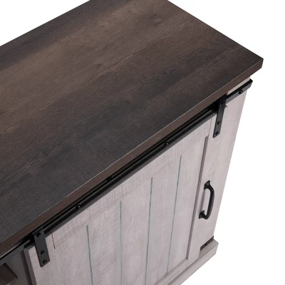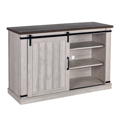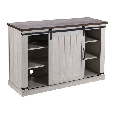 This TV stand features a coast-to-coast sliding barn-door design with one full-sized cabinet with left and right partitions. Each partition features up to 3 adjustable open shelves. The cable management cutouts will keep your audio and video cables clean and tidy. Its ranch rustic style would perfectly match your current decor. Elevate your living room as well as your TV set with this beautiful TV stand.