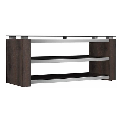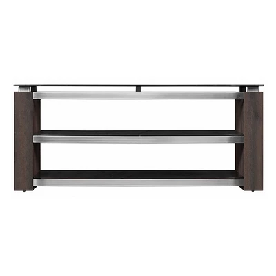 Give your entertainment area a flourish that combines minimalist design and a modern finish with the Cedar Manor Bowfront TV Stand by Twin Star Home.This entertainment center has a durable frame with convenient storage space for gaming systems, cable boxes, and other AV components. With brushed nickel framing accenting its bowfront design, this stand is open and minimalist, yet provides the organization you need. The center compartment features 2 fixed shelves for easy installation of all your electronic accessories. With a spacious and wide top, this stand easily accommodates TVs up to 55 inches and up to 55 pounds. With the included manual and easy-to-follow instructions, this center is easy to assemble and will have you organized and enjoying your favorite shows, movies, and games in no time.Liven up your living room with the warm and open design of the Cedar Manor TV Stand and Entertainment Cent by Twin Star Home.