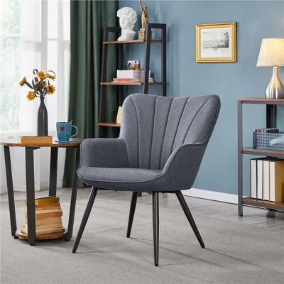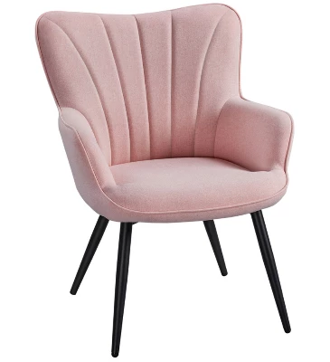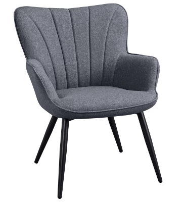 - Inspired by traditional decor, this modern accent chair combines clean lines with a curved back. The soft fabric cover contrasts with the tapered metal legs, adding a simple but inviting tone to your home. The wooden frame and metal legs provide you strong support which can hold up to 276lb. The padded cushioned seat, back and armrest provide you with ultimate comfort and strong support. The pleated pattern on the fabric backrest added an elegant feeling, this upholstered armchair will be a good addition to the living room, bedroom, dining room, guestroom, home office and restaurant.