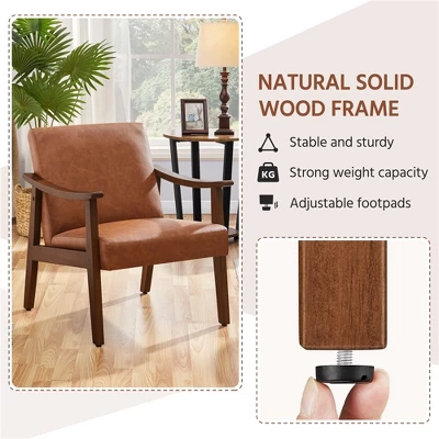 - This faux leather accent chair combines a mid-century modern style with a warm color tone, which will easily blend with any home decor. The brown leather upholstery complements the wood side frame, bringing a charming and retro vibe to your room. The armchair features a solid wood & manufactured wood frame for excellent sturdiness and stability. With a cushioned seat and tilt backrest, you can comfortably sink in while relaxing. Plus, the low-profile design and extra-long armrest add an extra laid-back feel. A great addition to the living room, bedroom, office, or guestroom of your house or apartment.